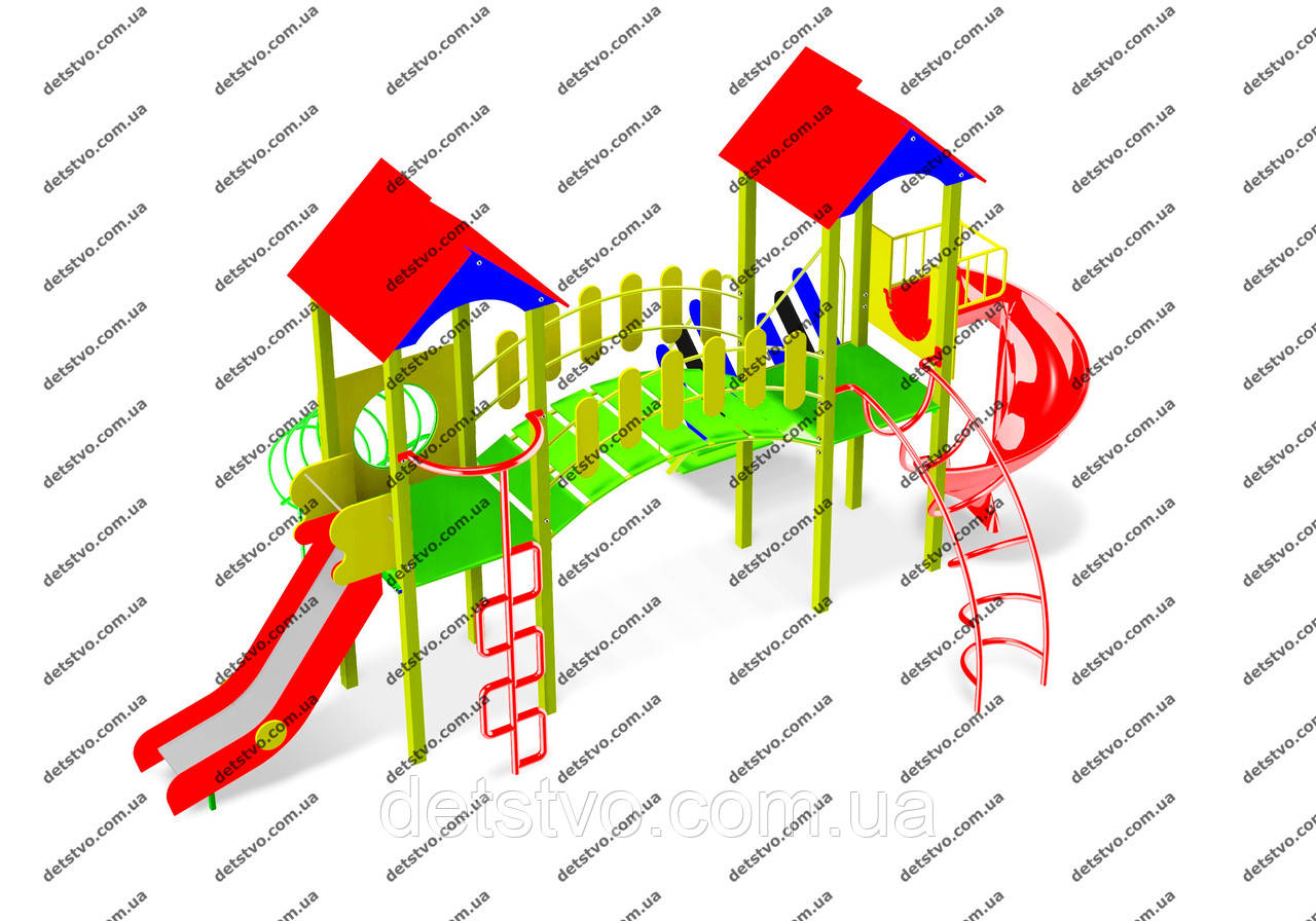 дві башти з закритим дахом, балкон, перехідний місток по дузі з поруччям, сходи з поруччям, спуск "Тунель", спуск "Ліана", жердина "Сходинки", гірка Н спуску=1,5м, гірка пластикова "Спіраль" Н спуску=1,5м, Д=6,2м, Ш=3,5м, В=3,3м